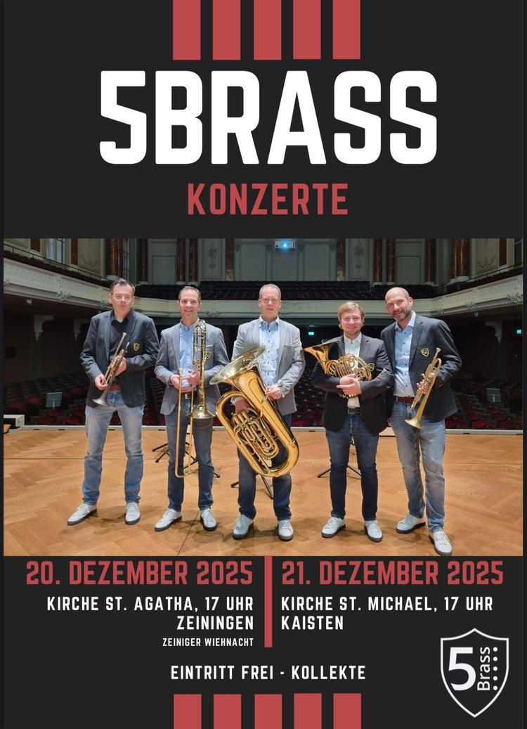5BRASS ist ein Brass Quintett aus der Nordwestschweiz. Das Ensemble besteht aus zwei Trompeten, einem Waldhorn, einer Posaune und einer Tuba. Die diesjährigen Konzerte finden statt am: Sa. 20. Dezember 2025, 17.00h / Kirche St. Agatha, Zeiningen AG So. 21. Dezember 2025, 17.00h / Kirche St. Michael, Kaisten AG
