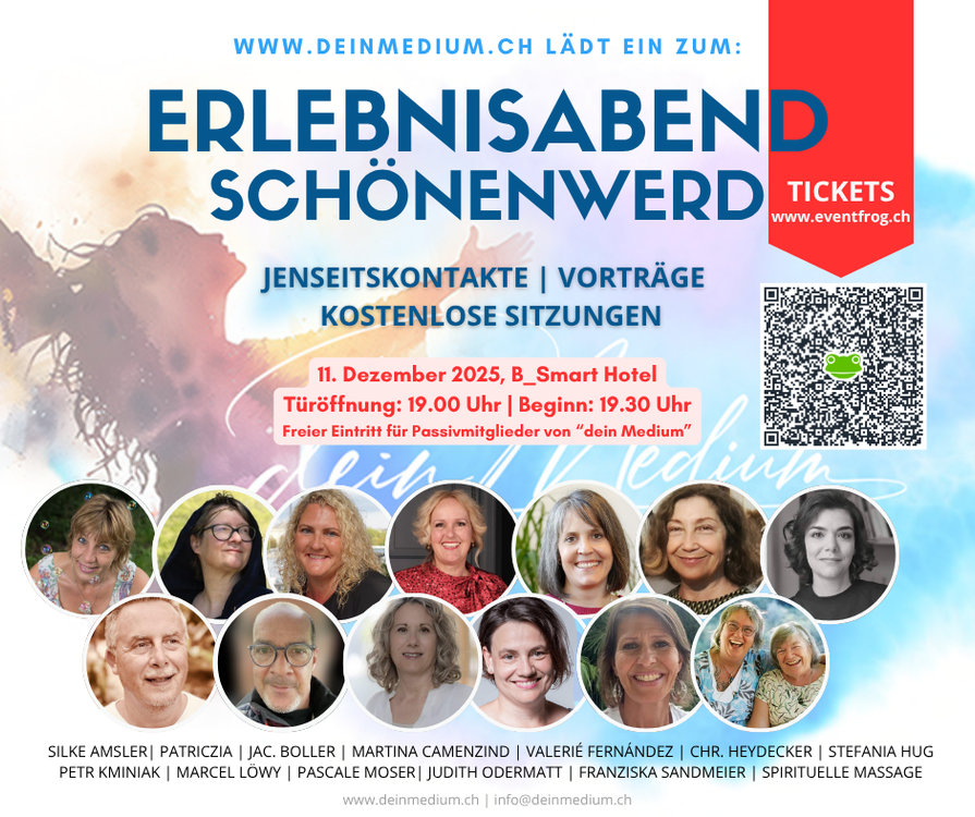 Freue dich auf berührende Jenseitskontakte sowie inspirierende Vorträge. Zusätzlich hast du die Möglichkeit, eine kostenlose Einzelsitzung von 25 Minuten zu erleben. (U.a. mediale Beratungen, Jenseitskontakte, Heilsitzungen, Tarotlegen, Spirituelle Massage u.v.m.) Die Vergabe dieser kostenlosen Sitzungen erfolgt am Veranstaltungsabend direkt vor Ort durch eine Verlosung unter den Anwesenden. Mitglieder von "dein Medium" haben freien Eintritt. (nur mit gültigem Mitgliederausweis!)
