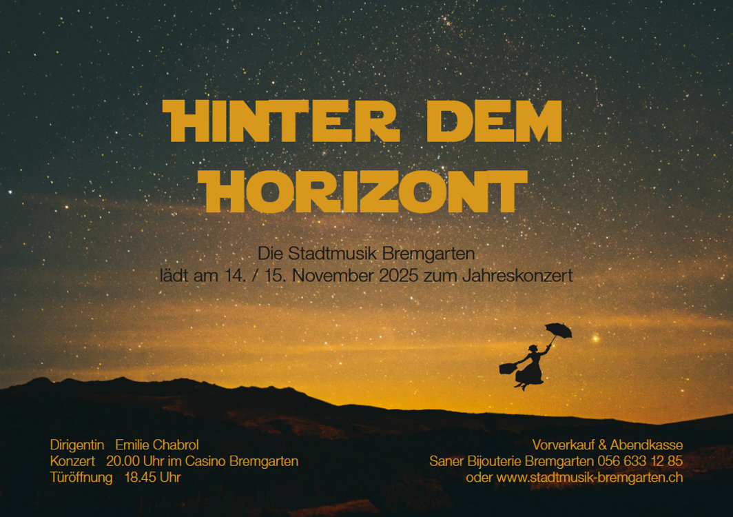 Liebe Musikfreunde Unter dem Titel „hinter dem Horizont“ laden wir euch herzlich zu unserem diesjährigen Jahreskonzert ein – eine musikalische Reise, die über das Gewohnte hinausführt und neue Klangwelten eröffnet. Mit der packenden Komposition „Saga Maligna“ – unserem Wahlstück für das Eidgenössische Musikfest 2026 – tauchen wir ein in eine geheimnisvolle Erzählung voller Spannung und Energie. Bekannte Filmklänge aus „Star Wars“ entführen uns in ferne Galaxien, wo Abenteuer und Hoffnung miteinander verschmelzen. Und mit den unvergesslichen Melodien aus „Mary Poppins“ sind Leichtigkeit, Freude und ein Hauch Nostalgie angesagt. Ein Konzert voller Kontraste, Emotionen und musikalischer Magie – wir freuen uns sehr, wenn ihr diesen besonderen Abend mit uns erlebt! Datum: Freitag, 14. November und Samstag, 15. November 2025 Beginn: 20 Uhr (Türöffnung 18.45 Uhr) Ort: Casino Bremgarten Reservationen: https://www.stadtmusik-bremgarten.ch/ oder über die Bijouterie Saner Bremgarten. Kommt vorbei, bringt Freunde mit und lasst euch von der Musik hinter den Horizont tragen. Wir freuen uns auf euch!
