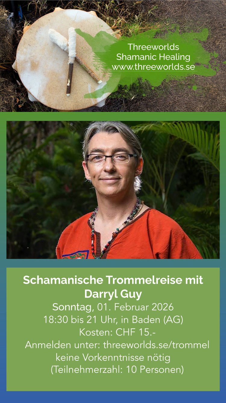 Die schamanische Trommelreise findet im Physiotherapieraum von Renée L. Deltenre statt. Jede/r Teilnehmer*innen liegt bequem auf der eigenen Matte. Das Reisen mit den Trommelklängen ist eine tausend Jahre alte Technik, sie führt auf eine Reise in die innere Erlebnislandschaft. An diesem Sonntag öffnet und hält Darryl mit seiner Trommel einen Raum um sich dem spirituellen Krieger zu widmen, sich mit dem inneren Krieger zu verbinden und Balance zu finden. Die Trommelreise unterstützt dabei, die eigene innere Stärke, Weisheit und Mitgefühl zu finden, zu erkennen und zu entfalten. Darryl ist in Australien geboren und aufgewachsen und befindet sich mehr als 30 Jahren auf dem Weg des Schamanismus. Er vereint Wissen, dass er von verschiedenen Medizin-Frauen und Männern wie auch Kulturen gesammelt hat. Die Trommelreise wird auf Deutsch übersetzt. Mehr Informationen über Darryl und seine Arbeit: https://www.threeworlds.se Anmeldung für die Trommelreise: contact@threeworlds.se +46707997224 (Whatsapp, Telegram) Mitnehmen: Wasserflasche, bequeme Kleidung, bei Bedarf Schreibzeug Max. 10 Teilnehmende Feedback von der letzten Trommelreise: "Am 19. Oktober durfte ich in Baden (AG) bereits zum zweiten Mal an einer Trommelreise / SoulFlight mit Darryl und Mara teilnehmen – und es war erneut wundervoll. Was diese Reisen so besonders macht, sind nicht nur die Trommeln oder die Prozesse, sondern die Menschen, die den Raum halten. Darryl und Mara erschaffen mit ihrer Präsenz, Klarheit und Herzenswärme einen Raum, in dem tiefe Heilung, Verbindung und Vertrauen ganz natürlich entstehen dürfen. Es ist spürbar: Wundervolle Menschen erschaffen wundervolle Räume. Räume, in denen man loslassen, fühlen, erinnern und einfach sein darf. Von Herzen danke für diese Erfahrung, für eure Hingabe und für den sicheren Raum, den ihr öffnet und haltet. Absolute Empfehlung für alle, die echte Tiefe und authentische Seelenarbeit suchen. ✨????" Ralf Haase Weiter Angebote von Darryl im Januar/Februar 2026 in der Schweiz: Am 20.01.2026 und 21.02.2026 bietet Darryl Termine für persönliche 1:1 Behandlungen an, um individuelle Themen aufzuarbeiten und Heilung zu erfahren. In der ersten Hälfte der Sitzung bringt Darryl die Energiesysteme des Körpers wieder ins Gleichgewicht, und Heilung darf geschehen. Im weiteren Verlauf der Sitzung werden Lösungen für bewusste oder auch unbewusste Probleme erarbeitet und mithilfe von Journey-Work-Techniken transformiert. Eine schamanische Heilbehandlung hilft beim Wiedererlangen verlorener oder beim Entdecken neuer Lebensqualität. Die Behandlungen finden im Jupiterhaus im Frankental in Zürich statt. (1:1 Sessions sind auf Englisch) https://www.threeworlds.se/personal_healing_session 24.01.2026 Santos Ninos Velada, traditionelle schamanische Zeremonie, mehr Informationen und Anmeldungsdetails: https://www.threeworlds.se/velada
